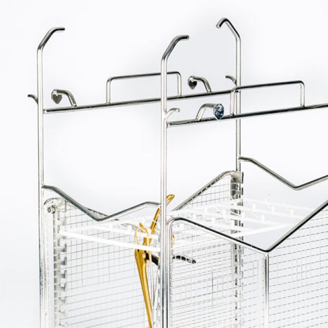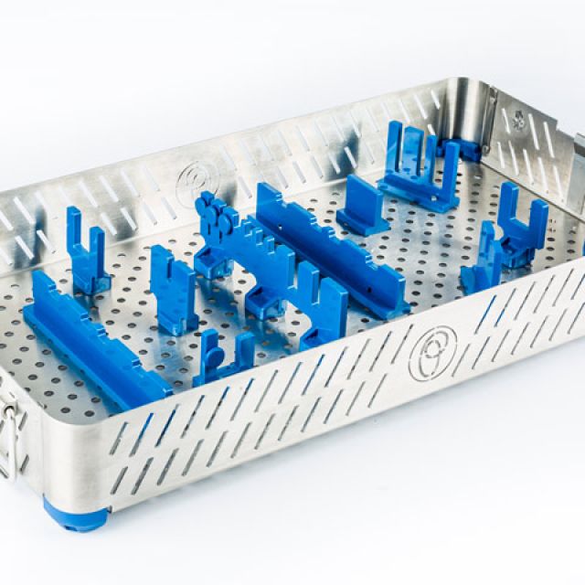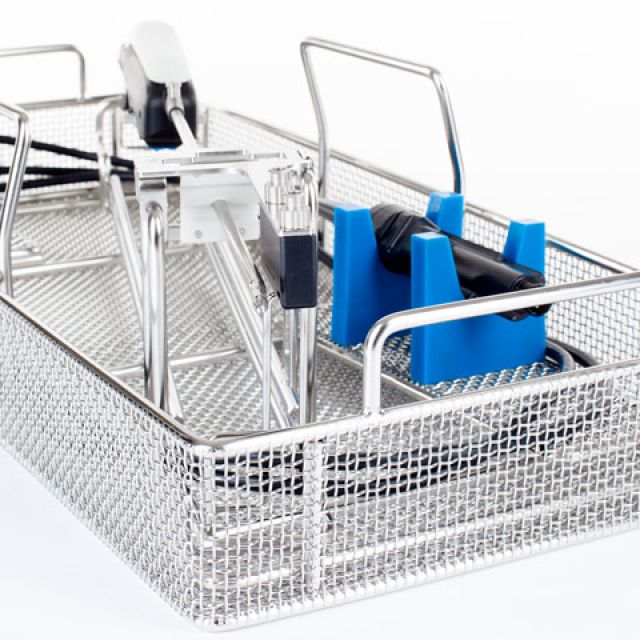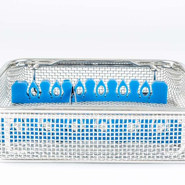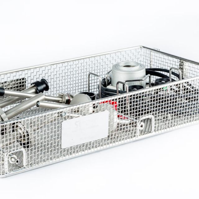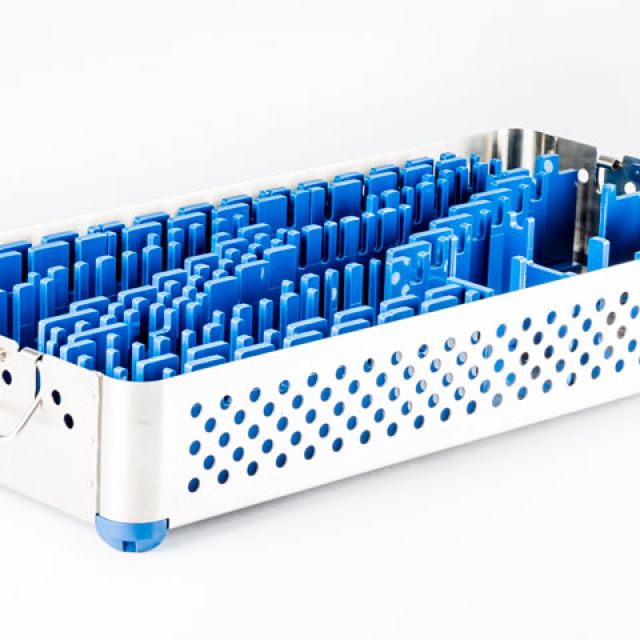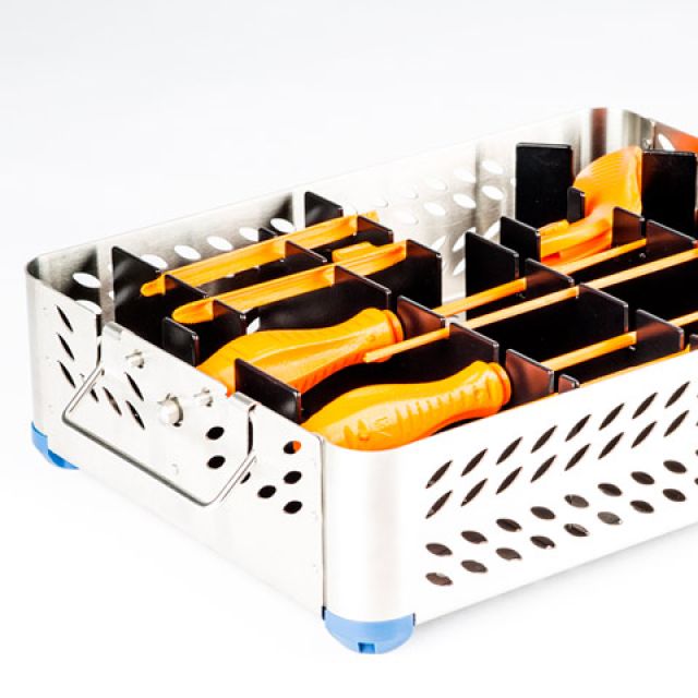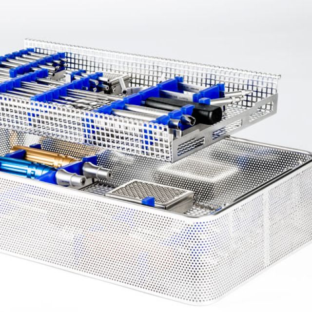 Stainless steel baskets with placement layout of instruments and prostheses designed specifically for sterilization, storage and logistics.