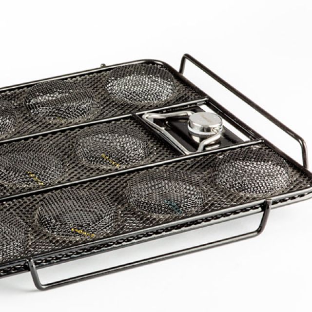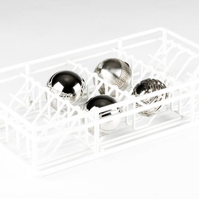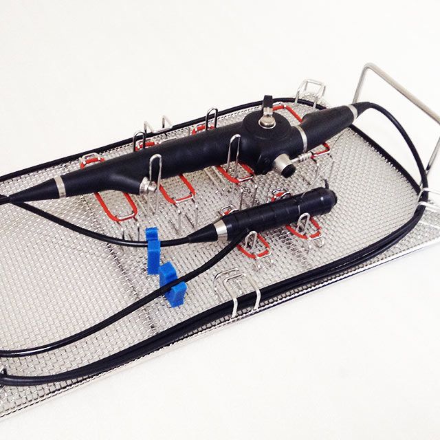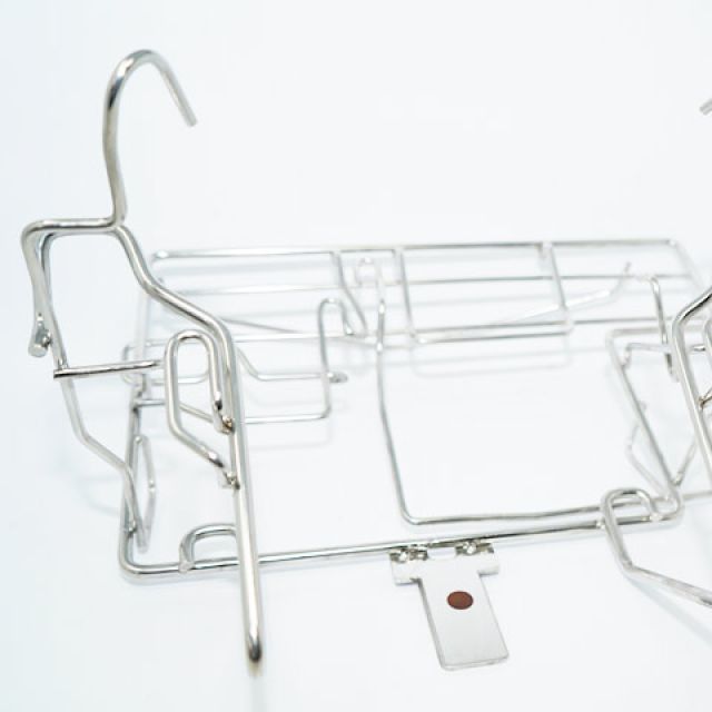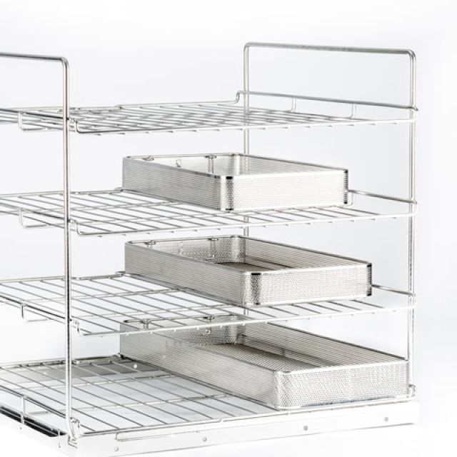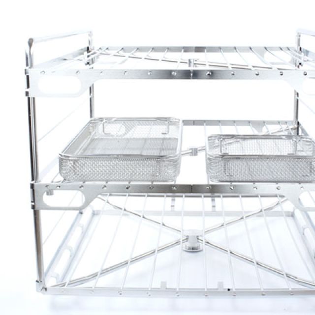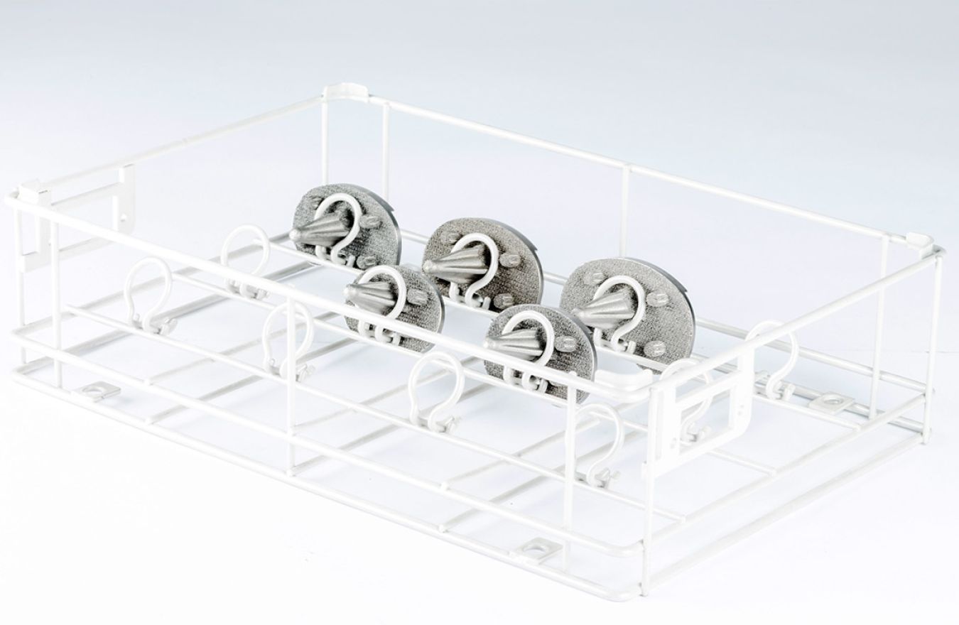 Stainless steel baskets with placement layout of instruments and prostheses designed specifically for sterilization, storage and logistics.